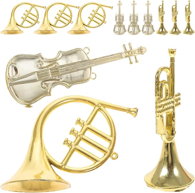 12pcs Musical Instrument Christmas Ornaments, Gold French Horn Trumpet Violin